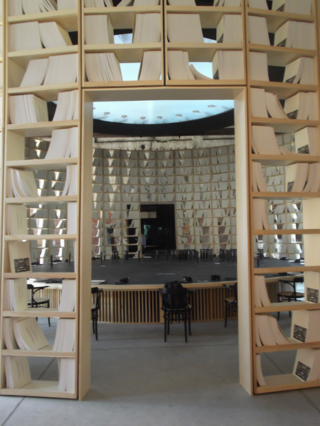 Monditalia: tra video con il meglio del cinema italiano, spazi fisici dedicati a performance teatrali e di danza, si snodano le magnifiche cattedrali architettoniche degli Anni ’50 ormai abbandonate, ma non dimenticate, i fallimenti del G8 dell’isola della Maddalena e dell’Aquila, ma anche il magnifico viso di Monica Vitti nei film di Antonioni, la loro casa alla Maddalena, l’avanguardia degli intellettuali degli Anni ’70, le nostre potenzialità ancora inespresse e un emozionante come eravamo in bianco e nero. Il tutto all’interno degli spazi unici e pieni di fascino dell’Arsenale di Venezia.