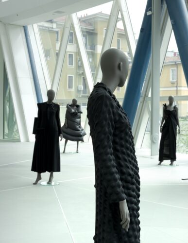 Da qui nasce il legame tra l’opera del maestro italiano e il Sol Levante, come ha puntualizzato Silvia Casagrande attraverso il progetto espositivo e il saggio appositamente firmato, portando alla luce sorprendenti affinità tra Burri e i fashion designer giapponesi. Accanto al tema del nero, infatti, troviamo quello dell’ombra, del vuoto, della piega, del taglio, della sutura e della struttura che si intrecciano alle sperimentazioni deimaestri della moda, fautori di una rivoluzione del linguaggio dell’abito.