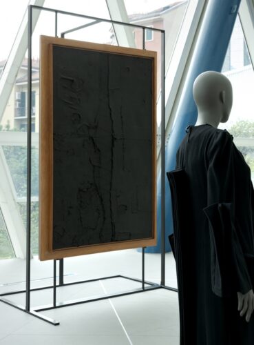 Il capolavoro Nero con punti di Alberto Burri, appartenente al Patrimonio Artistico di Unipol, è posto in dialogo con cinque straordinarie creazioni di Issey Miyake,Yohji Yamamoto e Junya Watanabe, tra i più radicali designer giapponesi contemporanei.