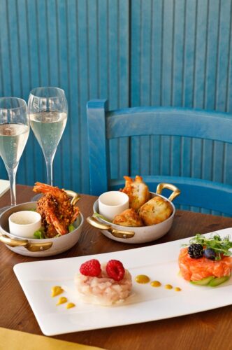 Nel menu spicca il pescato del giorno, e l’irrinunciabile fritto, leggero e gustosissimo, è un piatto forte che sicuramente rende grande questo locale. Potrete ovviamente degustare una sezione dei crudi che include non solo tartare e carpacci ma anche plateaux royales con ostriche di diverse qualità, il tutto da abbinare ad una delle prestigiose etichette presenti nella curata cantina. Menzione a parte per la paella che abbraccia sempre la mediterraneità e vista la grande richiesta avuta in altri locali della proprietà, è stata inserita nel menù sia nella classica versione alla “Valenciana” con carne e pesce, sia nella versione di solo Marisco. Completano il menù alcuni piatti vegetariani e una pizza “ruota di carretto”, molto friabile e croccante.