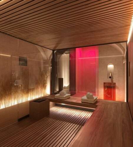 Il benessere ruota attorno alla spa, all’interno del complesso monastico e include piscina panoramica, sauna, cisterna riscaldata e aree relax dove è possibile fruire di trattamenti personalizzati e attività di meditazione.