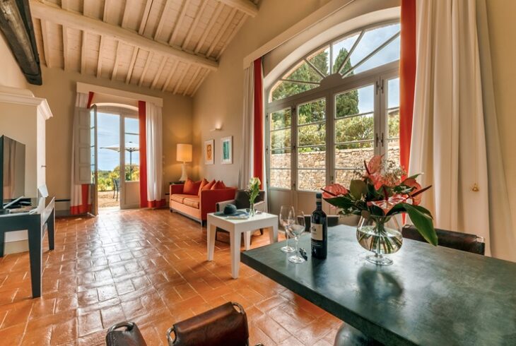 All’interno della tenuta di 500 ettari, tra vigneti, oliveti e produzioni d’eccellenza, si trovano le 52 sistemazioni suddivise in camere, suite e ville,
