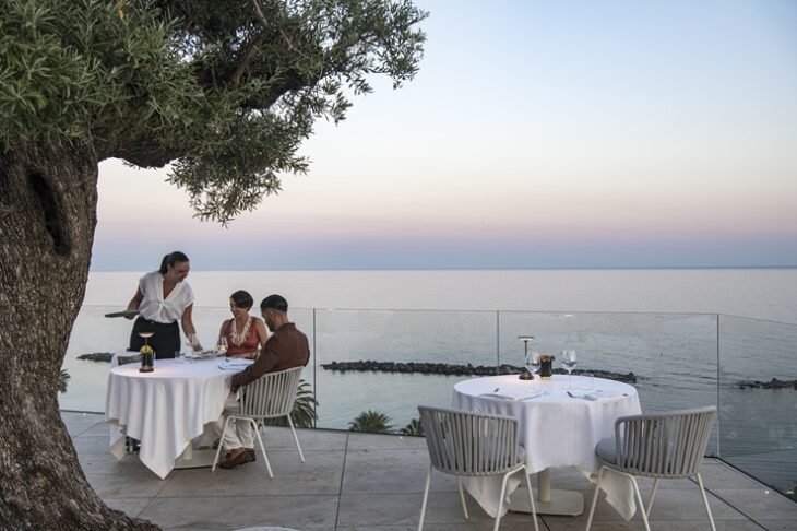 Al sesto piano, la terrazza panoramica The RUFtop invita a lasciarsi incantare da un’esperienza gourmet tra cielo e mare. Affacciata sul blu del Mediterraneo e sulle luci scintillanti del Casinò, durante la bella stagione accoglie ospiti interni ed esterni per cene indimenticabili. Cruditè di mare, bollicine e suggestioni mediterranee sono le protagoniste, in un luogo magico dove ulivi secolari e altalene sospese raccontano l’anima più autentica della Riviera. Il menu, sempre a cura dello chef Schiavon, esalta la materia prima locale con piatti sorprendenti: dai tagliolini all’astice con zafferano e fiori di zucca, alla frittura “cacio e pepe” con lime, fino al dessert “Liguria–Langhe”. Ogni cena qui si trasforma in un piccolo evento da ricordare. Completano l’offerta il ristorante interno, solitamente riservato agli ospiti, ma pronto a trasformarsi in un teatro per eventi gastronomici eccezionali aperti alla città.