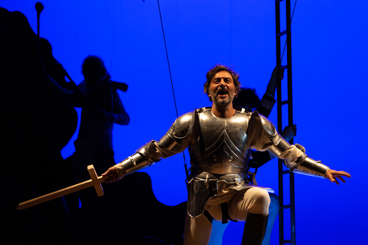 Lo spettacolo? E’ decisamente giullaresco (ottimi tutti gli interpreti), rappresentati da uno scudiero, un menestrello, una prostituta e l’angelo custode, che accompagnano l’autore, alla ricerca unanime della felicità, attraverso atmosfere tragicomiche, voci intonate, decisamente “perugina” quella dell’autore, che meglio ancor accompagna le gesti seicentesche di Timi. Si susseguono scene surreali, accompagnate da colori forti e decisi, che rendono uno spettacolo davvero speciale.