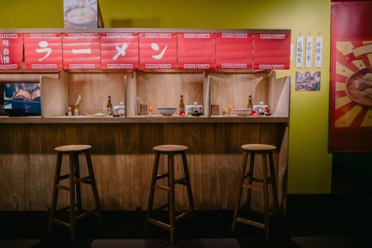 La sala ricrea un rāmen bar ispirato ai locali tradizionali giapponesi, con una lunga schiera di postazioni in legno individuali che separano i clienti, permettendo di gustare la pietanza in una piccola dimensione intima ma accogliente.