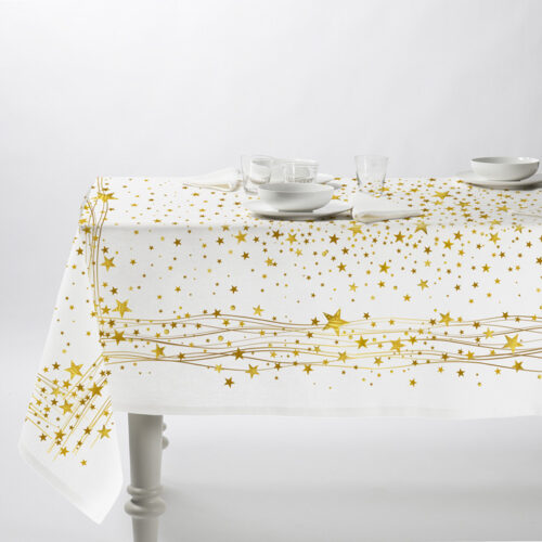 Stelle scintillanti, cristalli di ghiaccio e fiori natalizi: declinati su tovaglie, tovaglioli, runner e tea towel in cotone.