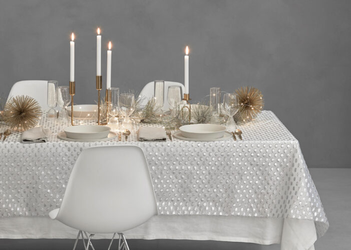 La tavola di Natale si veste con la tovaglia Ricelux di Society Limonta, un grigio chiarissimo con accenni di luce dati da un sottile filo di lamé argento. L’apparecchiatura è essenziale, elegante e raffinata. La tovaglia Ricelux, in lino e cotone è lavorata a jacquard con un piccolo motivo a chicco di riso, tessuto nella tovaglia. Pensata per il Natale, è perfetta per ogni cena speciale e semplicemente chic.