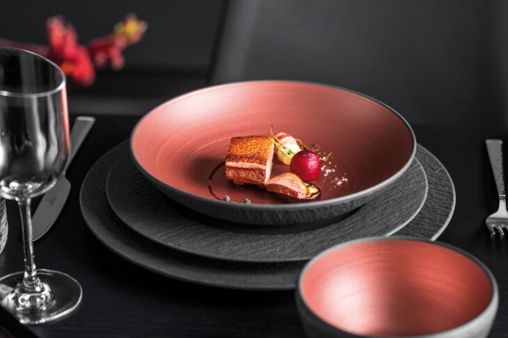 In Manufacture Rock e Manufacture Glow fuoco e roccia prendono vita: i piatti, le coppe e le ciotole  dall’intenso colore nero, in autentica porcellana ardesia, ricordano le formazioni rocciose scolpite nel corso di milioni di anni. Il rosso rame di Manufacture Glow richiama il calore intenso e ammaliante del fuoco.