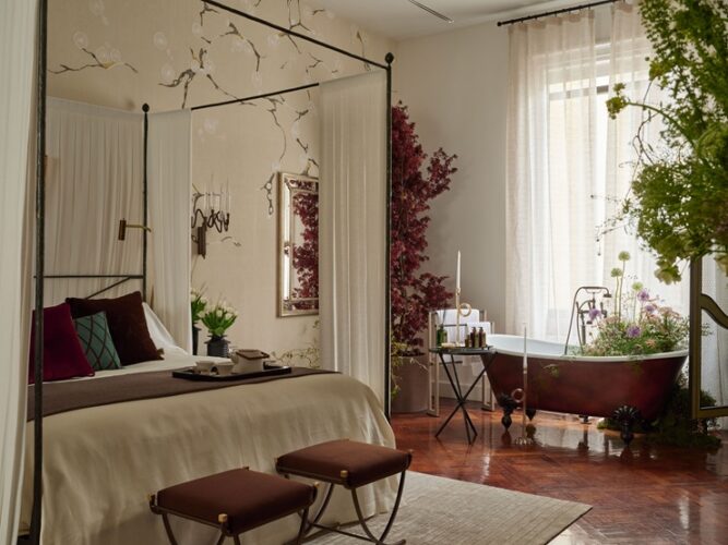 L’alcova di Urjowan Alsharif Interiors è invece un omaggio a Firenze, concepita come uno spazio sospeso tra arte, artigianato e suggestioni della campagna toscana. Ispirata agli interni rinascimentali e alle ville storiche, l’atmosfera è intima, poetica e senza tempo. Al centro, un letto a baldacchino in ferro battuto, avvolto da morbidi drappeggi, richiama le camere del passato. L’ambiente celebra la cultura del fare fiorentina attraverso lavorazioni pregiate – dal legno al cuoio, dal ferro ai dettagli decorativi – in un dialogo continuo tra tradizione e contemporaneità.