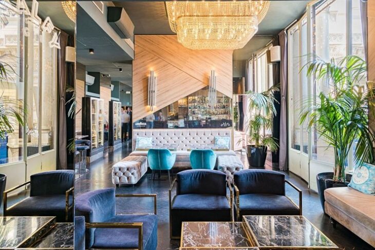 Il fascino del locale risiede nel suo straordinario equilibrio architettonico, curato dall’architetto Andrea Langhi. Specializzato nella progettazione di locali pubblici, Langhi ha ideato uno spazio dove il design contemporaneo dialoga con l’eleganza storica e liberty di uno dei palazzi più iconici di Milano. Gli interni colpiscono per gli alti soffitti e gli affreschi d’epoca, che creano un raffinato contrasto con arredi moderni e sofisticati giochi di specchi. Ogni scelta progettuale è stata attenta e misurata per inserirsi con naturalezza nel contesto preesistente, offrendo ambienti eleganti che si aprono direttamente sulla piazza e sulla suggestiva Galleria Vittorio Emanuele II.