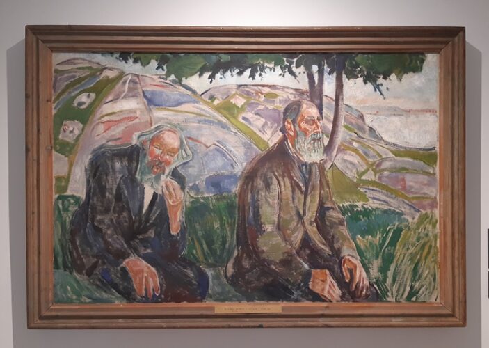 Sopra, Edvard Munch, Due Anziani, 1910ca, olio su tela. In alto con il titolo una sala della Mostra