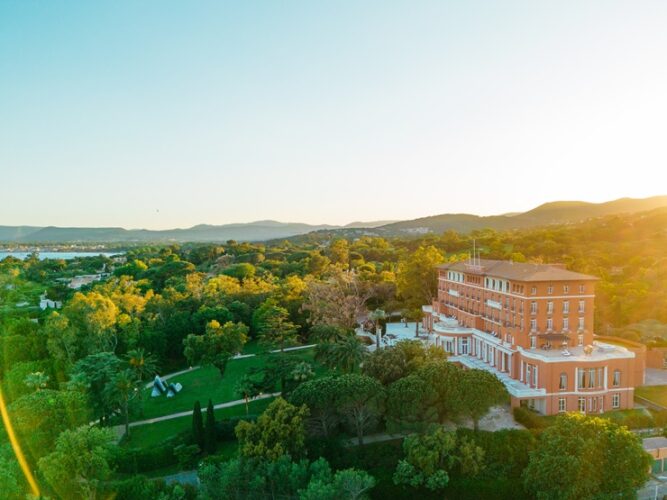 La proprietà in stile Belle Époque operativa dal 1914, ornata come un pizzo fiorito da 10 acri di terrazze con giardini mediterranei e pini marittimi affacciati sulla baia di Saint-Tropez, offre 25 suite con vista mare.