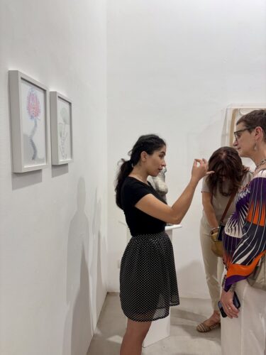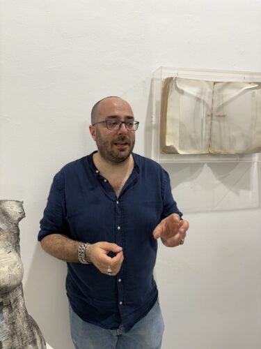 Mahnaz Ekhtiary espone Presente, assente, un busto di cartapesta realizzato con pagine di giornali italiani e iraniani; Anna Giuntini lavora sul concetto di comunicazione, anzi di mancanza di comunicazione, sostituendo i fili fotografati dei tralicci dell’elettricità (fili conduttori di comunicazione per eccellenza, dunque) con preziosi fili d’oro fisici, simbolo della preziosità e delicatezza dell’essere compresi (o no); René Pascal fa meta-arte, utilizzando l’AI per descrivere alcune foto in bianco e nero dei primi del Novecento reperite nei mercatini e poi ridotte in coriandoli di varie forme racchiusi in “boccette dei desideri”, tipo message in a bottle.