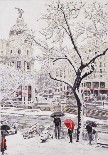 Madrid es la ciudad en la que más he vivido y la que más he pintado. Nunca acabaré de descubrirla y sorprenderme cada día. Lo que me atrae de la Gran Vía es que sus edificios te piden pintarlos. Sin como parte de una gran escenario deteatros. Sus edificios son emblemáticos e icónicos. Al mismo tiempo, la vida en la calle representa la realidad de lo que es la gente de la calle en Madrid. Pinto también el mar porque me encanta, crecí a su lado, se encuentra en mi retina, por eso me atraen las ciudades que tienen mar.