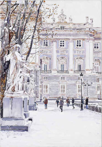 Le gusta pintar los detalles de los tejados, remates de edificios… una gran observadora amante de la arquitectura y sus múltiples detalles. Tiene mucha obra a nivel calle, donde disfrutas del momento, del instante, de todo lo que está a su alrededor cambiando constantemente. Encuentra belleza al mirar Madrid desde las alturas con sus azoteas rematadas con ilustres esculturas que aparecen entre cúpulas y tejados en el cielo…
