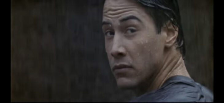 Right after the camera’s vision is blurred out, we cut to Johnny Utah, sitting on his car, under the rain, a gunshot in his hand (see picture 3). It is a drastic and intentional shift from the previous shot, as, with mise-en-scéne and colour grading, the difference between the two characters is emphasised. The music becomes more solemn, like a military hymn, as a whistle is blown by an FBI trainer, who points towards Utah, outside the frame. We then get a close-up of the film’s protagonist, who, in typical 90s style, turns his face towards the camera (see picture 4). Two things stand out from this shot that are directly comparable to the shots we saw of Bodhi. Firstly, this shot of Utah is a close-up and we never get a close-up of Bodhi. We actually never get to see Bodhi’s face at all during the opening credits. This is done to achieve a sense of mystery surrounding Brodhi’s character, as throughout the whole movie he does not simply represent a specific person, but rather an idea; an idea of freedom from the system, the same way that Heath Ledger’s Joker in The Dark Knight (2008) did not have a backstory or a clear goal, he just represented the idea of total anarchy. Secondly, in the shot of Utah’s face the camera is put at mid-angle, whilst in all of Bodhi’s shots the camera is placed at a low angle; the viewer is placed at the same level as Utah, we are supposed to identify with him and to recognise he is the protagonist, while Brodhi is perceived as an external figure that will cross paths with the protagonist, but nevertheless incredibly important, as shown by the low angle which emphasises his power.