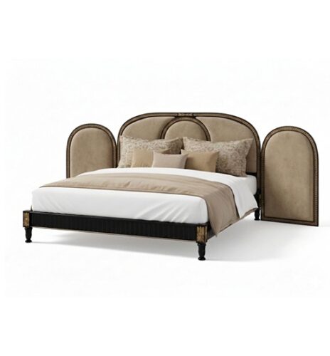 Il letto Lysiane è in stile Luigi XVI, caratterizzato da una scenografica testata centrale suddivisa in tre sezioni a cui si aggiungono due ante laterali, per arredare l’ambiente. L’elemento circolare centrale e i due pannelli laterali sono rivestiti in pelle nabuk beige, mentre le due parti restanti della testata sono in tessuto tramato sui toni del beige. Integrata una lampada con interruttore. I nuovi comodini Coco di Opera Contemporary, disegnati dallo stesso designer, presentano una struttura in frassino tinto noce canaletto avvolta da un elemento in metallo rivestito in pelle nabuk bordeaux.