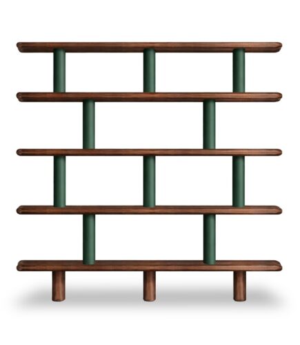 Pensata come elemento di separazione elegante e funzionale tra gli ambienti, la libreria bifacciale Tokyo del Designer Daniel Christopher, ridefinisce gli spazi. I ripiani e le gambe a terra sono in legno di frassino tinto noce canaletto, mentre i divisori centrali e superiori sono laccati, in continuità con le altre zone dell’esposizione: color verde oliva che guarda verso il living, color bordeaux dal lato rivolto verso la camera da letto.