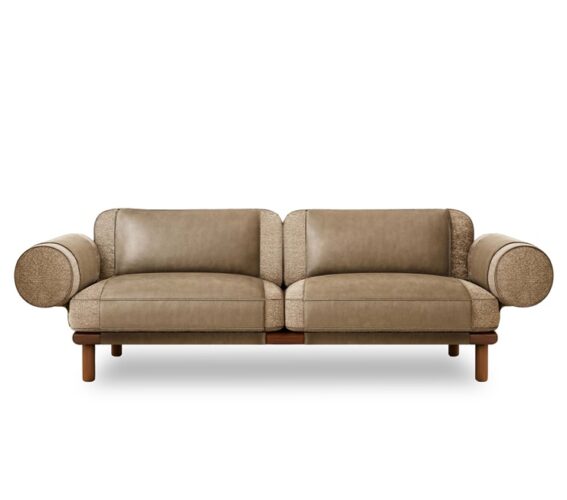 A completare l’ambiente, la poltrona Bruce Restyling 2026, un rifacimento della iconica Bruce di Opera Contemporary, si distingue per il nuovo design dei braccioli che abbracciano la struttura e raffinati bottoni che creano un elegante effetto di movimento all’esterno. La struttura in noce canaletto con puntali a terra in metallo nero cromato è completata da un’imbottitura di rivestimento in nabuk senape.