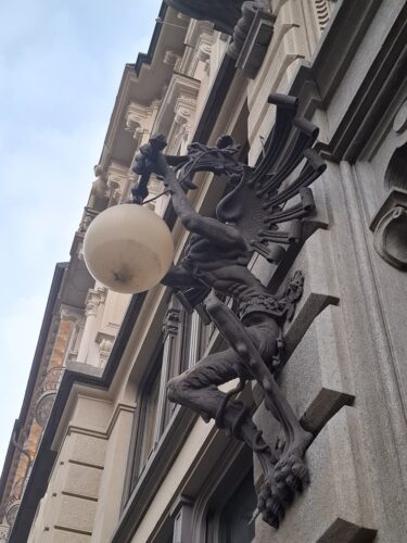 Ma a colpire sono soprattutto i temi pagani, esoterici e massonici che si incontrano passeggiando per le vie del centro storico: mostri raffigurati dai mascheroni, demoni portatori di luce, portone del diavolo (in particolare quello di Palazzo Trucchi di Levaldigi circondato da una leggenda nera di delitti irrisolti), immagini che rinviano all’arte muratoria e “occhi” scavati sul marciapiede di via Lascaris, a indicare una direzione ben precisa a chi sapeva cosa cercare.