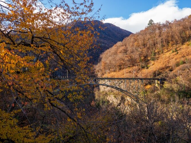 La Ferrovia Vigezzina-Centovalli collega da oltre un secolo Domodossola, in Piemonte, a Locarno, in Canton Ticino. Lungo 52 chilometri di binari, i treni attraversano vallate, gole e pianori punteggiati da castagni, betulle e faggete. In autunno i paesaggi si tingono di giallo, arancio e rosso, offrendo ai viaggiatori lo spettacolo del foliage, da ammirare comodamente seduti a bordo dei convogli, alcuni dei quali di ultima generazione.