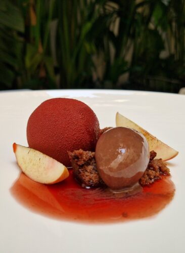 Il dessert ha tutta l’iconicità della specialità romana per eccellenza, le pesche al vino, ma in una chiave a sorpresa.