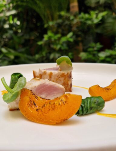 Il classico pollo coi peperoni di tradizione diventa infatti il “polpo e peperoni” dell’antipasto, tocco iodato anche nel primo, “Pasta fagioli e cozze”, e nel secondo, “Ricciola affumicata, albicocche e aceto di mele”, il mare si sposa alle note di dolce freschezza della frutta.