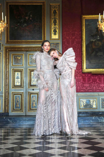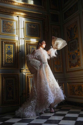 Ziad wanted this collection sexy, slightly frivolous , in order to regain the carefree life of yesterday. The dresses are majestic, transparent, airy, the ostrich feathers mingle with silk and lace. All pieces are entirely hand-embroidered in the designer’s atelier, lockdown has given time to time …for example the wedding dress required 3 months of work, or 3 months of escape …
